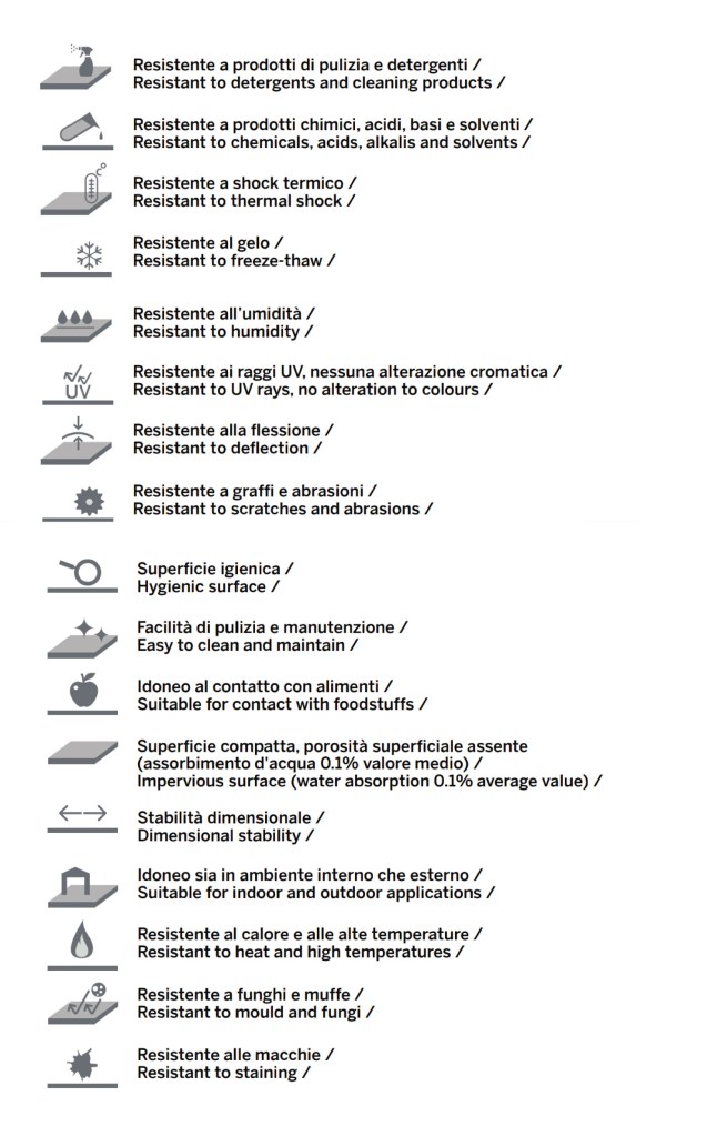 Il gres porcellanato è una ceramica compatta non porosa ottenuta da argille feldspati, caolini e sabbia, materie prime che vengono macinate finemente ed impastate. Avviene poi una cottura in forno ad una temperatura compresa tra i 1250 e 1350 gradi. A tali temperature avviene una fusione parziale chiamata greificazione. Dopo tale processo si raggiunge stato di vetrificazione e impermeabilità con valori di assorbimento inferiori alla 0,3 % . Si tratta di un prodotto con un’elevata resistenza alle sollecitazioni meccaniche, agli attacchi chimici, ai graffi e all’abrasione. La tecnologia avanzata con la quale viene prodotto permette di essere facilmente igienizzabile, resistere agli sbalzi di temperatura, al fuoco, alle muffe e ai raggi UV senza alterare colori, caratteristiche e proprietà.
